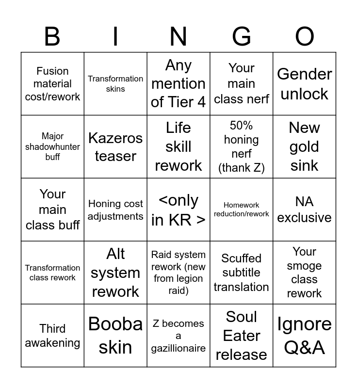 This bingo card has a free space and 31 words: Z becomes a gazillionaire, Pheon cost nerf, Honing cost adjustments, Gems rework, Fusion material cost/rework, Any mention of Tier 4, Kazeros teaser, Scuffed subtitle translation, Homework reduction/rework, Soul Eater release, NA exclusive, Ignore Q&A, Guild system rework, Card system rework, New gold sink, Free class changes, Your smoge class rework, Alt system rework, Transformation class rework, Raid system rework (new from legion raid), Gender unlock, Unreal Engine 5, Third awakening, Transformation skins, 50% honing nerf (thank Z), Major shadowhunter buff, Your main class nerf, Your main class buff, Booba skin, Life skill rework and Major NA economy effect.