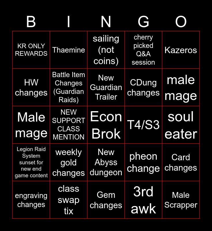 This bingo card has a free space and 24 words: weekly gold changes, class swap tix, New Guardian Trailer, engraving changes, Kazeros, KR ONLY REWARDS, HW changes, Thaemine, T4/S3, New Abyss dungeon, CDung changes, Male mage, pheon change, Card changes, Battle Item Changes (Guardian Raids), 3rd awk, soul eater, sailing (not coins), male mage, NEW SUPPORT CLASS MENTION, Male Scrapper, Legion Raid System sunset for new end game content, cherry picked Q&A session and Gem changes.