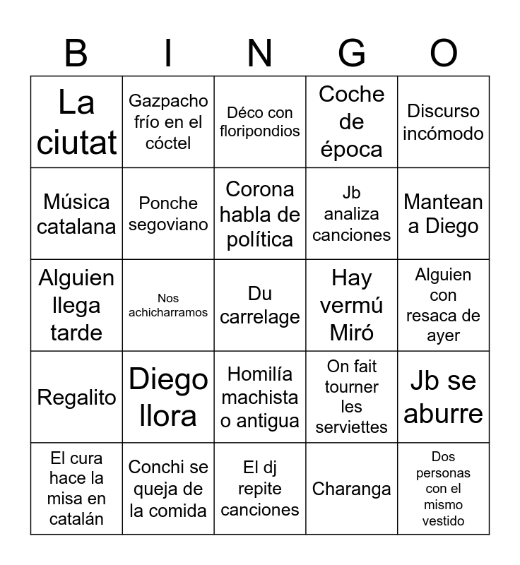 This bingo card has a free space and 24 words: Diego llora, Conchi se queja de la comida, Corona habla de política, El cura hace la misa en catalán, Discurso incómodo, La ciutat, Música catalana, Gazpacho frío en el cóctel, Hay vermú Miró, Homilía machista o antigua, Jb analiza canciones, Alguien llega tarde, On fait tourner les serviettes, Jb se aburre, Ponche segoviano, Charanga, Alguien con resaca de ayer, Déco con floripondios, Mantean a Diego, Nos achicharramos, Dos personas con el mismo vestido, Regalito, Coche de época and El dj repite canciones.