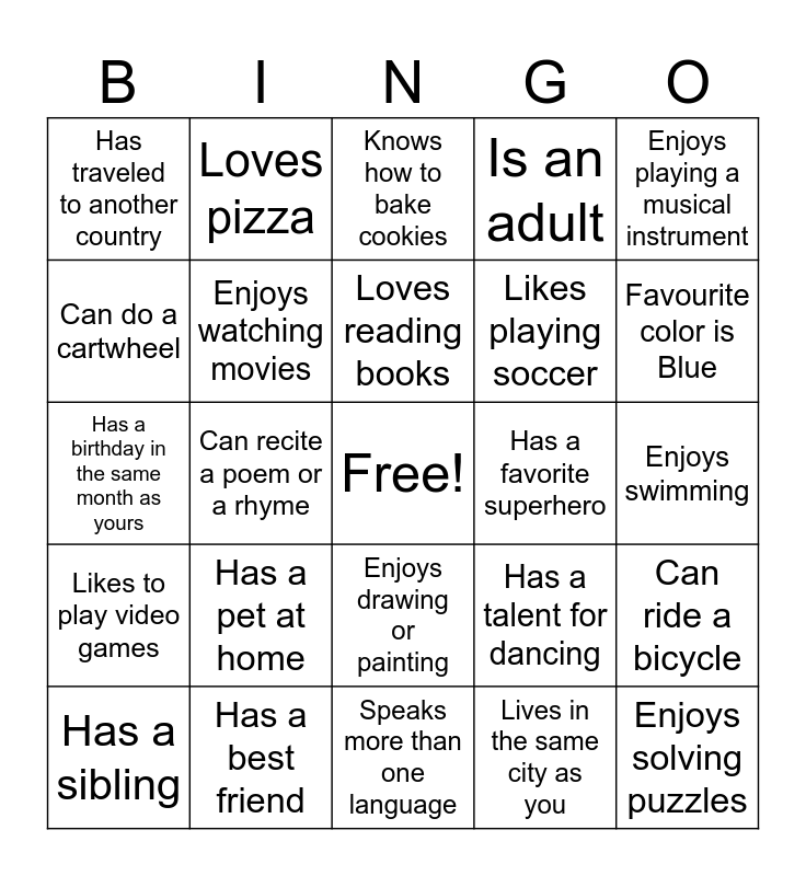 This bingo card has a free space and 25 words: Has a pet at home, Speaks more than one language, Loves reading books, Has a sibling, Enjoys playing a musical instrument, Has traveled to another country, Can do a cartwheel, Loves pizza, Has a favorite superhero, Enjoys drawing or painting, Likes playing soccer, Has a birthday in the same month as yours, Has a talent for dancing, Can ride a bicycle, Enjoys watching movies, Likes to sing, Enjoys swimming, Knows how to bake cookies, Favourite color is Blue, Can recite a poem or a rhyme, Enjoys solving puzzles, Has a best friend, Likes to play video games, Is an adult and Lives in the same city as you.