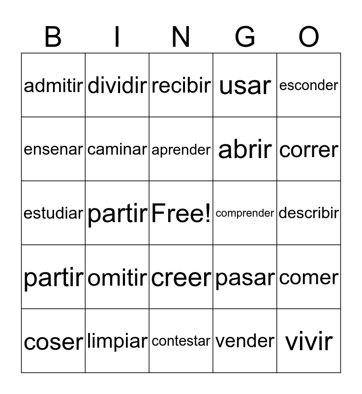 This bingo card has a free space and 31 words: contestar, deber, partir, subir, admitir, recibir, caminar, pasar, comprender, vender, describir, vivir, hablar, anadir, correr, llevar, comer, omitir, partir, creer, esconder, romper, coser, dividir, abrir, ensenar, usar, estudiar, limpiar, aprender and ver.