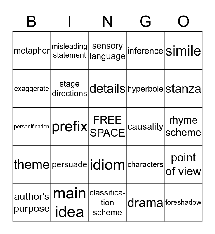 This bingo card has a free space and 24 words: persuade, main idea, details, author's purpose, simile, metaphor, exaggerate, misleading statement, causality, idiom, hyperbole, personification, characters, point of view, stage directions, drama, rhyme scheme, sensory language, stanza, prefix, foreshadow, theme, inference and classifica- tion scheme.