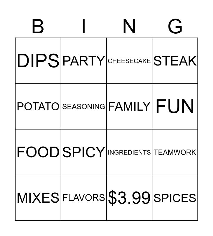 This bingo card has a free space and 15 words: MIXES, SPICES, CHEESECAKE, DIPS, FUN, POTATO, SPICY, $3.99, SEASONING, FOOD, TEAMWORK, STEAK, FAMILY, PARTY and FLAVORS.