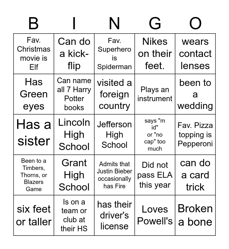 This bingo card has 25 words: Grant High School, has their driver's license, visited a foreign country, six feet or taller, wears contact lenses, Fav. Christmas movie is Elf, Has Green eyes, Can do a kick-flip, says "mid" or "no cap" too much, Admits that Justin Bieber occasionally has Fire, Plays an instrument, Has a sister, Did not pass ELA this year, can do a card trick, Can name all 7 Harry Potter books, Broken a bone, Fav. Pizza topping is Pepperoni, Fav. Superhero is Spiderman, been to a wedding, Lincoln High School, Jefferson High School, Is on a team or club at their HS, Been to a Timbers, Thorns, or Blazers Game, Nikes on their feet. and Loves Powell's.
