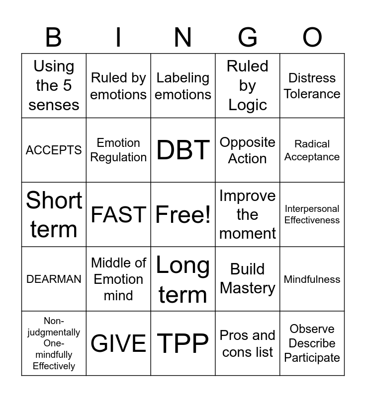 This bingo card has a free space and 24 words: Middle of Emotion mind, GIVE, DBT, Non-judgmentally One-mindfully Effectively, Distress Tolerance, Using the 5 senses, ACCEPTS, Ruled by emotions, Improve the moment, Long term, Opposite Action, Short term, Build Mastery, Mindfulness, Emotion Regulation, Pros and cons list, Interpersonal Effectiveness, Labeling emotions, Radical Acceptance, FAST, Observe Describe Participate, DEARMAN, Ruled by Logic and TPP.