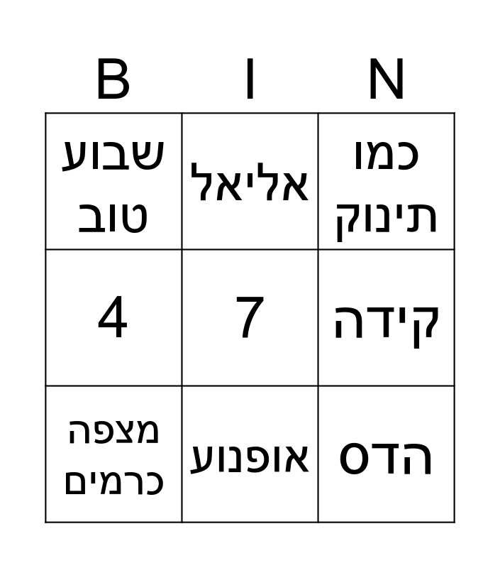 This bingo card has a free space and 17 words: 2, סושי, כמו תינוק, שבוע טוב, אופניים, 4, י"ט סיוון, מצפה כרמים, אופנוע, קידה, עילי, 3, הדס, אליאל, תפוזים, רואי and לשחק עם חברים בכדור.