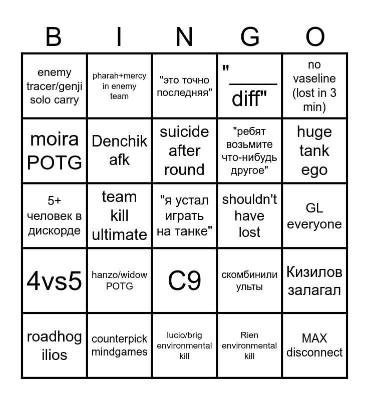 This bingo card has 25 words: hanzo/widow POTG, lucio/brig environmental kill, suicide after round, roadhog ilios, no vaseline (lost in 3 min), enemy tracer/genji solo carry, moira POTG, pharah+mercy in enemy team, shouldn't have lost, C9, "ребят возьмите что-нибудь другое", 5+ человек в дискорде, скомбинили ульты, Кизилов залагал, Denchik afk, MAX disconnect, GL everyone, "это точно последняя", huge tank ego, team kill ultimate, "я устал играть на танке", counterpick mindgames, 4vs5, "____ diff" and Rien environmental kill.