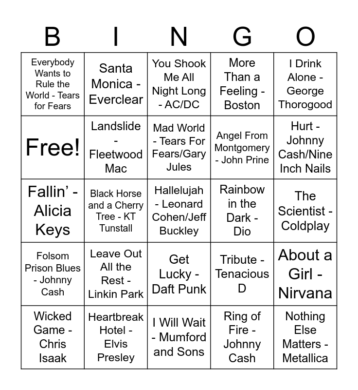 This bingo card has 61 words: I Can’t Help Falling in Love With You - Elvis Presley, Heartbreak Hotel - Elvis Presley, Brown Eyed Girl - Van Morrison, Folsom Prison Blues - Johnny Cash, Ring of Fire - Johnny Cash, Sweet Caroline - Neil Diamond, Landslide - Fleetwood Mac, Ain’t No Sunshine - Bill Withers, Angel From Montgomery - John Prine, I Wanna Be Sedated - The Ramones, More Than a Feeling - Boston, Over the Hills and Far Away - Led Zeppelin, Free!, Take Me Home Country Roads - John Denver, Walk This Way - Aerosmith, Everybody Wants to Rule the World - Tears for Fears, Hallelujah - Leonard Cohen/Jeff Buckley, I Drink Alone - George Thorogood, I’m Gonna Be (500 Miles) - Proclaimers, Mad World - Tears For Fears/Gary Jules, Rainbow in the Dark - Dio, You Shook Me All Night Long - AC/DC, Wicked Game - Chris Isaak, About a Girl - Nirvana, Down in a Hole - Alice In Chains, Everlong - Foo Fighters, Father of Mine - Everclear, Friends in Low Places - Garth Brooks, Hurt - Johnny Cash/Nine Inch Nails, I Want It That Way - Backstreet Boys, Iris - The Goo Goo Dolls, One Headlight - The Wallflowers, Run-Around - Blues Traveler, Smells Like Teen Spirit - Nirvana, Santa Monica - Everclear, Wonderwall - Oasis, Ain’t No Rest for the Wicked - Cage the Elephant, Black Horse and a Cherry Tree - KT Tunstall, Drift Away - Unkle Cracker, Fallin’ - Alicia Keys, Island in the Sun - Weezer, Leave Out All the Rest - Linkin Park, The Scientist - Coldplay, Seven Nation Army - White Stripes, Tribute - Tenacious D, Rio - Low Cut Connie, Levitating - Dua Lipa, All Too Well - Taylor Swift, Cecilia and the Satellite - Andrew McMahon, Get Lucky - Daft Punk, I Will Wait - Mumford and Sons, Like I’m Gonna Lose You - Meghan Trainor, Lovely - Billie Eilish, Old Town Road - Lil Nas X, Style - Taylor Swift, Tennessee Whiskey - Chris Stapleton, Wake Me Up - Avicii, Polly - Nirvana, Self Control - Laura Brannigan, Nothing Else Matters - Metallica and Rollin’ In the Deep - Adele.