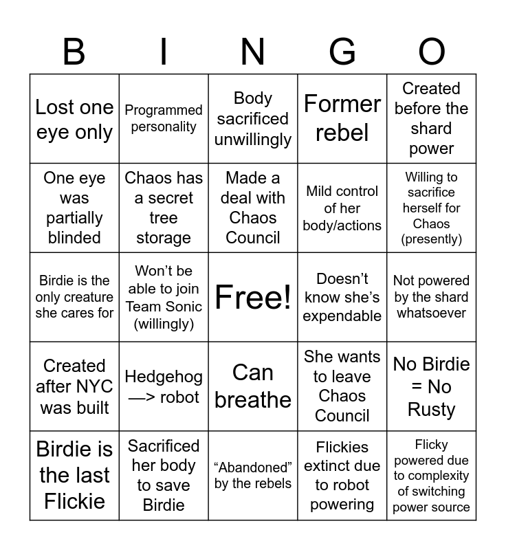 This bingo card has a free space and 24 words: Hedgehog —> robot, Sacrificed her body to save Birdie, Made a deal with Chaos Council, Birdie is the last Flickie, Created before the shard power, Lost one eye only, One eye was partially blinded, Programmed personality, Doesn’t know she’s expendable, Can breathe, Mild control of her body/actions, Birdie is the only creature she cares for, She wants to leave Chaos Council, No Birdie = No Rusty, Chaos has a secret tree storage, Flickies extinct due to robot powering, Not powered by the shard whatsoever, Body sacrificed unwillingly, Willing to sacrifice herself for Chaos (presently), Won’t be able to join Team Sonic (willingly), Flicky powered due to complexity of switching power source, Created after NYC was built, Former rebel and “Abandoned” by the rebels.