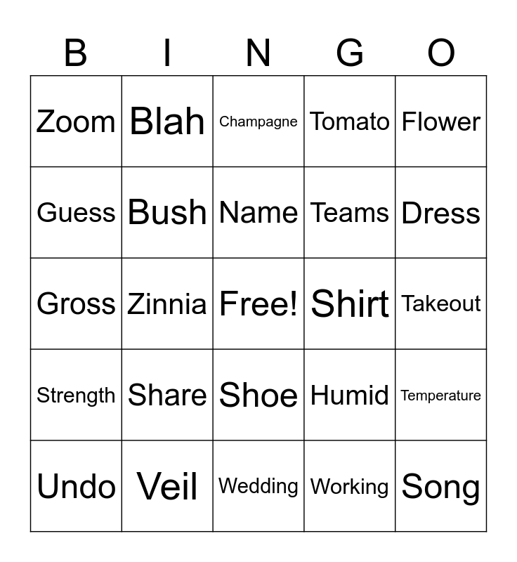 This bingo card has a free space and 50 words: Test, Song, Dance, Wedding, Share, Tester, Blah, Bingo, Guess, Tree, Bush, Tomato, Temperature, Humid, Tests, Chaos, Name, Shirt, Logo, Flower, Zinnia, Working, Zoom, Teams, Picture, Bride, Dress, Ring, Champagne, Shoe, Floor, Dance, Tux, Groom, Veil, Sunflower, Rain, Breeze, Carryout, Takeout, Thai, Jimmy, Pry, Leach, Undo, Gross, Good, Enough, Strength and Train.