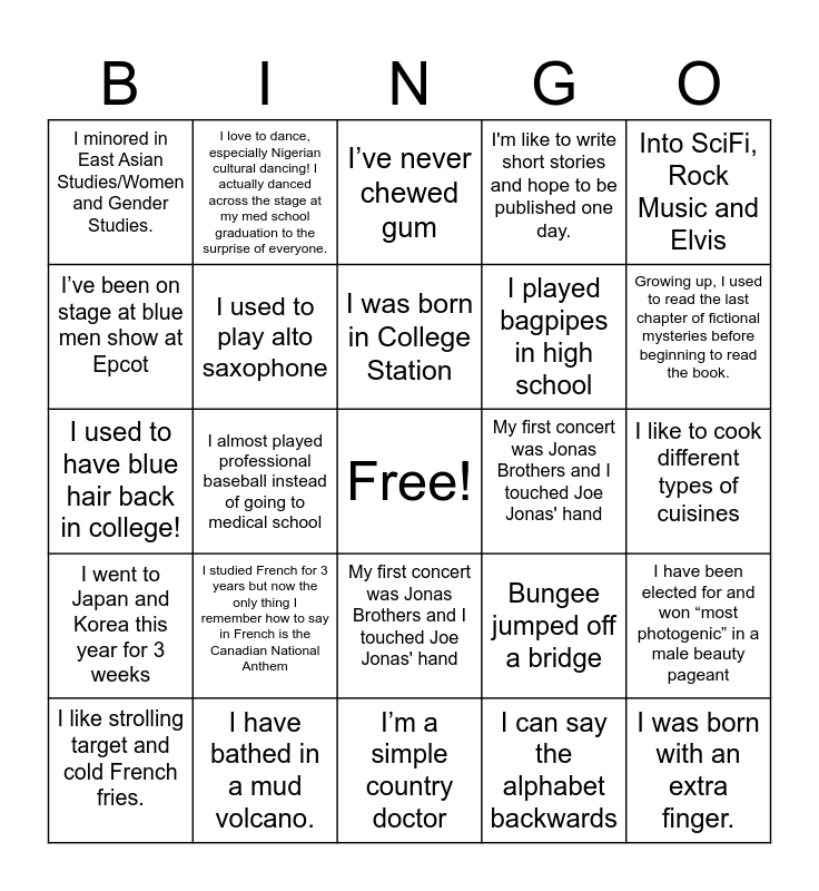 This bingo card has a free space and 44 words: I have someone who looks exactly like me who is also an IM resident., I was born with an extra finger., I earned a black belt in tae kwon do in high school but haven't practiced it since then., I like strolling target and cold French fries., I've lived in 15 different homes., I can say the alphabet backwards, I’ve never chewed gum, I am a PGY 39, Into SciFi, Rock Music and Elvis, I have bathed in a mud volcano., I'm like to write short stories and hope to be published one day., My first concert was Jonas Brothers and I touched Joe Jonas' hand, My first concert was Jonas Brothers and I touched Joe Jonas' hand, I studied French for 3 years but now the only thing I remember how to say in French is the Canadian National Anthem, I'm a twin, I’m a simple country doctor, I have modeled on billboards, magazines, and video recordings representing my institutions, I used to have blue hair back in college!, I like long walks on the beach, Growing up, I used to read the last chapter of fictional mysteries before beginning to read the book., I love to dance, especially Nigerian cultural dancing! I actually danced across the stage at my med school graduation to the surprise of everyone., I lived in Kenya, Africa for a year as a child, I am shy at first but an easy going person., I minored in East Asian Studies/Women and Gender Studies., I have an unhealthy love for all things pretty. Form comes before function, I like to cook different types of cuisines, Otter is my favorite animal, I threw for more yards than Johnny Manziel in 2009 when we were both juniors in high school, Bungee jumped off a bridge, I went to Japan and Korea this year for 3 weeks, Birthday is on St Patrick’s day, I have been elected for and won “most photogenic” in a male beauty pageant, I am the sneaker king, I won a jump roping contest once, I almost played professional baseball instead of going to medical school, I lived in alaska for a year, I play tennis often, I used to have a British accent!, I was born in College Station, I’ve been on stage at blue men show at Epcot, I played bagpipes in high school, The meaning of my name is money tree signifies prosperity and abundance in life., I used to play alto saxophone and I can sing my ABCs backwards!.