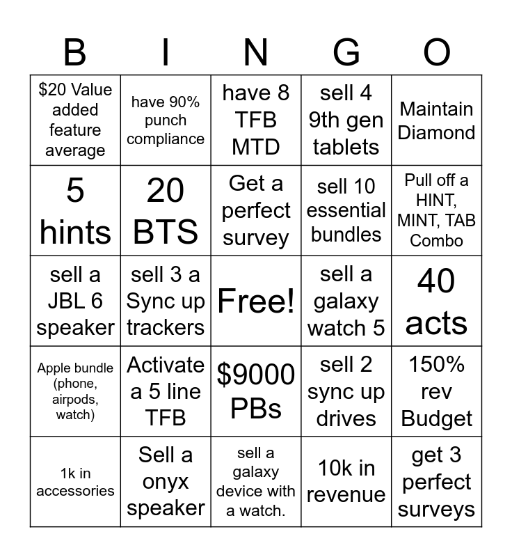 This bingo card has a free space and 24 words: Activate a 5 line TFB, Sell a onyx speaker, Get a perfect survey, 1k in accessories, Maintain Diamond, $20 Value added feature average, 5 hints, have 90% punch compliance, sell a galaxy watch 5, $9000 PBs, sell 10 essential bundles, sell a JBL 6 speaker, sell 2 sync up drives, 150% rev Budget, 20 BTS, 10k in revenue, 40 acts, have 8 TFB MTD, Pull off a HINT, MINT, TAB Combo, sell 3 a Sync up trackers, get 3 perfect surveys, Apple bundle (phone, airpods, watch), sell 4 9th gen tablets and sell a galaxy device with a watch..