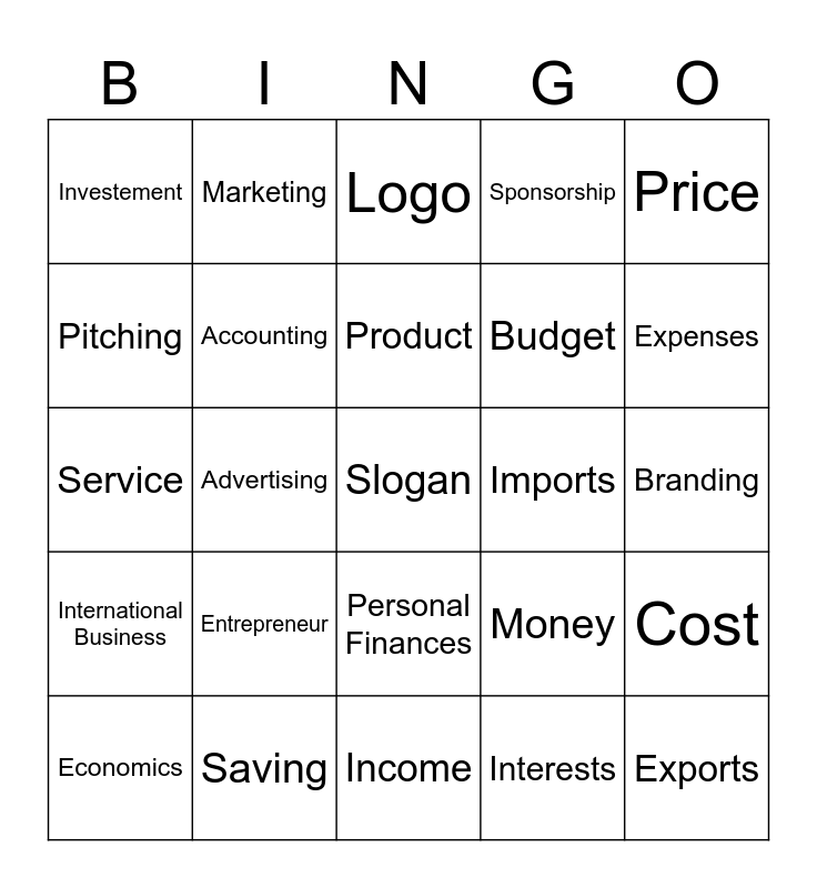 This bingo card has 25 words: Entrepreneur, Income, Product, Economics, Price, Investement, Pitching, Marketing, Imports, Personal Finances, Budget, Service, Money, Cost, Accounting, Exports, Branding, Logo, Expenses, Advertising, Slogan, Saving, International Business, Sponsorship and Interests.