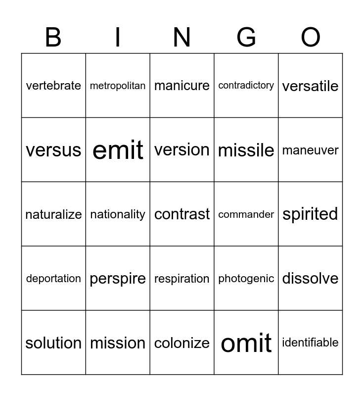 This bingo card has 60 words: admit, mission, rapport, deportation, omit, submit, emit, portable, missile, portfolio, contradictory, divert, versus, contrary, reverse, vertebrate, contrast, versatile, controversial, version, commander, manicure, solution, dissolve, manual, solvent, management, manuscript, maneuver, soluble, cosmopolitan, international, policy, gene, metropolitan, politician, generation, nationality, generosity, naturalize, flamingo, perspire, spirited, flammable, photogenic, telephoto, inflammation, photosynthesis, inspire, respiration, colonize, illegible, visualize, generalize, predictable, vocalize, horrible, socialize, identifiable and trivialize..