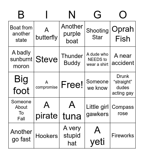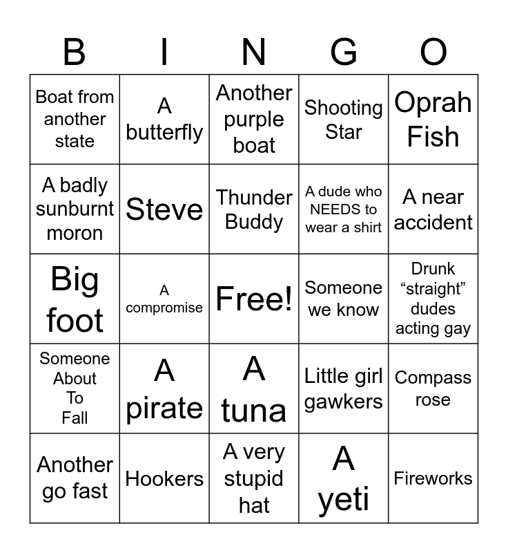 This bingo card has a free space and 39 words: Wake in the no wake, Blind duck, Larry, Steve, Another go fast, A tuna, Thunder Buddy, Shark, Oprah Fish, Someone About To Fall, A compromise, Shooting Star, Fireworks, Drunk “straight” dudes acting gay, Someone we know, A pirate, A shuttlecock, Boat from another state, Boat full of drunks, Little girl gawkers, A badly sunburnt moron, A very stupid hat, A dude who NEEDS to wear a shirt, A near accident, lady sailor, Your mom, Yard sale, Miserable Parents, mermaid, A butterfly, A yellow boat, An orange boat, Another purple boat, Hookers, A yeti, nautilus, Compass rose, Big foot and A rainbow.