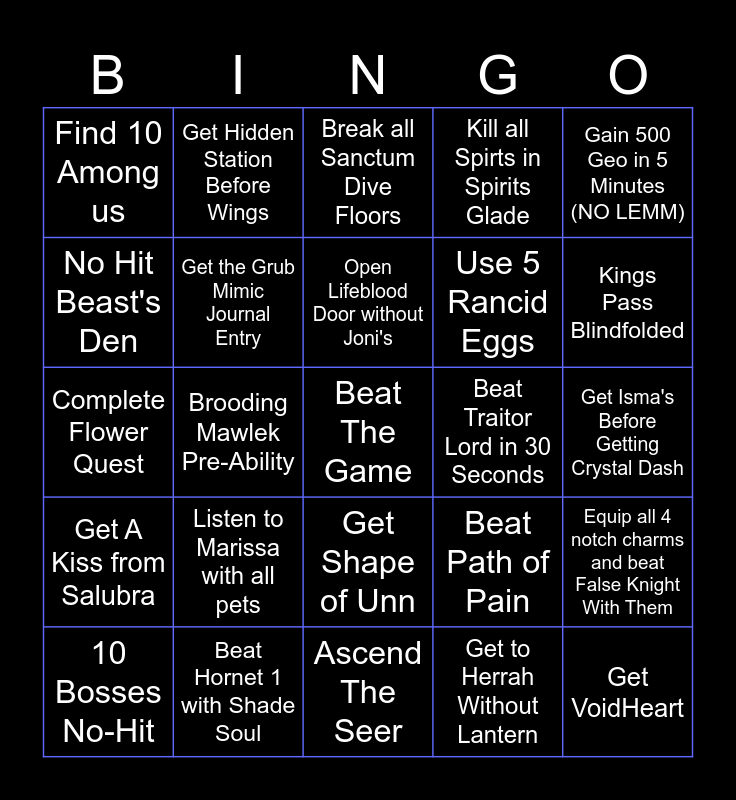 This bingo card has a free space and 24 words: Listen to Marissa with all pets, Beat Hornet 1 with Shade Soul, Open Lifeblood Door without Joni's, 10 Bosses No-Hit, Gain 500 Geo in 5 Minutes (NO LEMM), Find 10 Among us, No Hit Beast's Den, Get Hidden Station Before Wings, Beat Traitor Lord in 30 Seconds, Get Shape of Unn, Use 5 Rancid Eggs, Complete Flower Quest, Beat Path of Pain, Equip all 4 notch charms and beat False Knight With Them, Get the Grub Mimic Journal Entry, Get to Herrah Without Lantern, Get Isma's Before Getting Crystal Dash, Break all Sanctum Dive Floors, Kings Pass Blindfolded, Brooding Mawlek Pre-Ability, Get VoidHeart, Get A Kiss from Salubra, Kill all Spirts in Spirits Glade and Ascend The Seer.
