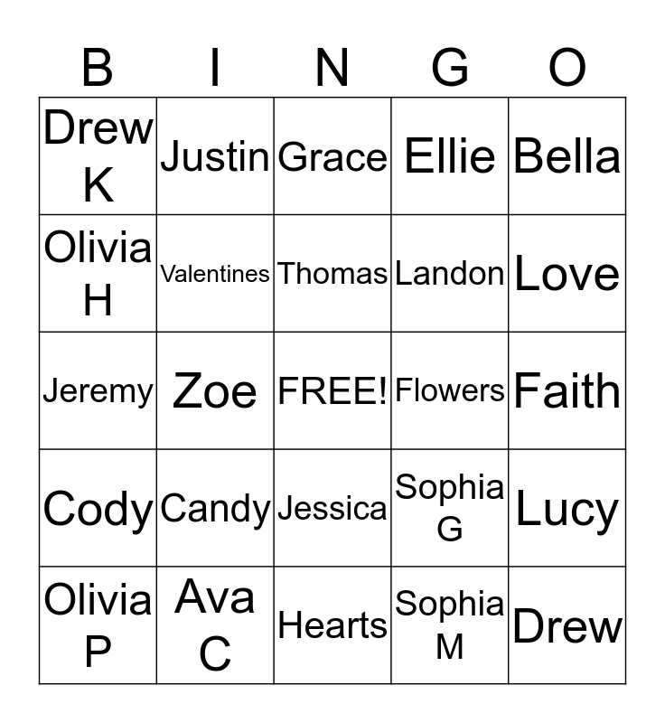 This bingo card has a free space and 26 words: Jessica, Sophia M, Thomas, Ava C, Bella, Drew K, Olivia H, Justin, Faith, Sophia G, Landon, Jeremy, Lucy, Olivia P, Zoe, Chucky, Ellie, Cody, Grace, Drew, Love, Hearts, Flowers, Candy, Valentines and Friends.