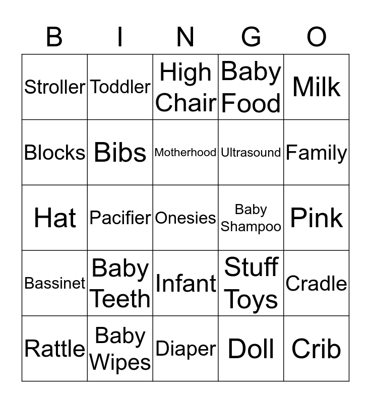 This bingo card has 25 words: Baby Teeth, Diaper, Motherhood, Rattle, Milk, Stroller, Blocks, Toddler, Baby Shampoo, Infant, Ultrasound, Hat, Stuff Toys, Cradle, Bibs, Crib, Pink, High Chair, Family, Pacifier, Onesies, Baby Wipes, Bassinet, Baby Food and Doll.
