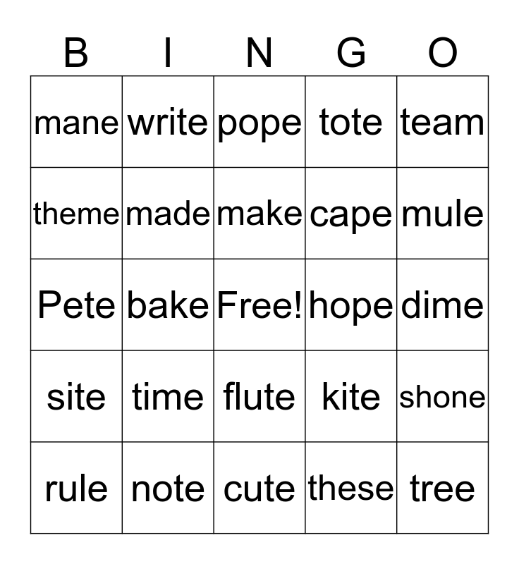 This bingo card has a free space and 24 words: time, note, make, rule, team, mane, theme, write, hope, flute, cape, Pete, kite, shone, made, these, dime, pope, mule, bake, tree, site, tote and cute.