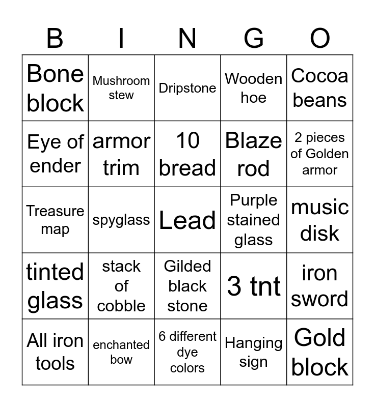 This bingo card has 108 words: 6 different flowers, Any type of horse armor, spyglass, Powered rail, Two types of Leaves, Crimson and warped trapdoor, Green dye, Cooked pork chop, 3 types of concrete, Lantern, Saddle, Potion of weakness, heart of the sea, Copper stair, 2 pottery shards, Enchanting table, Mushroom stew, Barrel, Cooked steak, 3 pieces of enchanted armor, stack of cobble, Cauldron, Honey, 3 repeaters, 5 different stained glass, Cocoa beans, Eye of ender, Wooden hoe, Golden hoe, Red carpet, Gold block, enchanted bow, 4 different doors, Five different crops, Lapis block, Dripstone, Brown wool, Any fish in a bucket, 3 books, Lead, Pumpkin pie, Fermented spider eye, 6 different dye colors, Suspicious stew, 5 different wool colors, armor trim, Slime ball, 10 bread, iron rail, Purple stained glass, Any terracotta, 2 pieces of Golden armor, tinted glass, Chiseled black stone, ender pearl, Pufferfish, Glow stone block, Note block, Iron hoe, Bone block, Stack of nether rack, Mushroom block, birch chest boat, strength potion, bookshelf, Glow ink sac, Nautilus shell, iron sword, Carrot on a stick, 3 tnt, Gilded black stone, Treasure map, Hanging sign, Brown mushroom, get all wooden tools, Red mushroom, brewing stand, Glow berries, 2 pieces of Leather armor, Warped fungus on a stick, spruce sapling, Rose bush, Yellow stained glass, All stone tools, pillager banner, Observer, 32 bone meal, Vine, Jukebox, Vine, Black wool, Blaze rod, Cooked mutton, Iron armor, Stack of deep slate, Pink dye, 2 Moss blocks, All iron tools, Beetroot soup, quartz stairs, 5 Mud brick slab, sticky piston, Any cooked fish, Comparator, cake, nether brick, music disk and Cooked chicken.