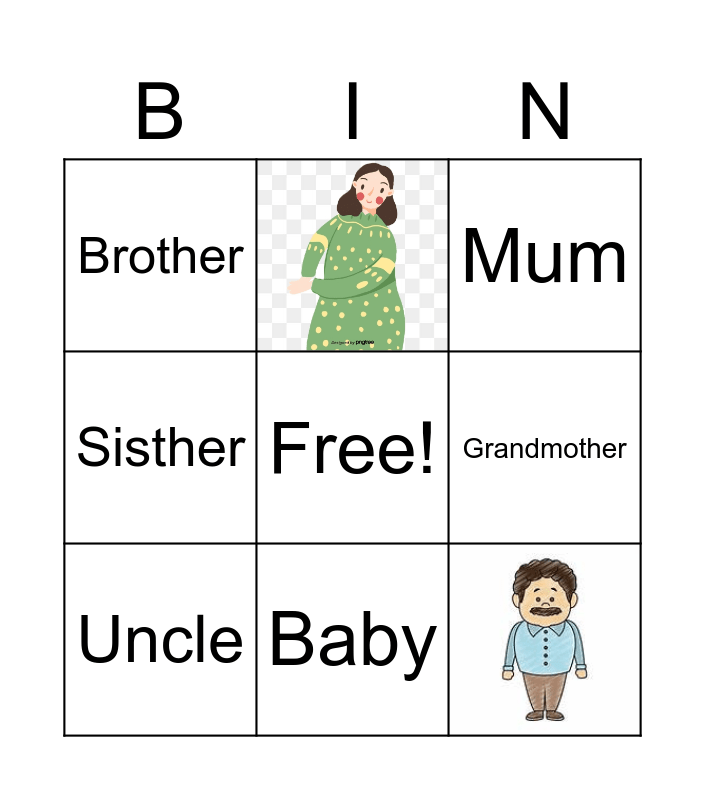 This bingo card has 7 images, a free space and 10 words: Aunt, Dad, Mum, Brother, Grandfather, Sisther, Cousin, Uncle, Baby and Grandmother.