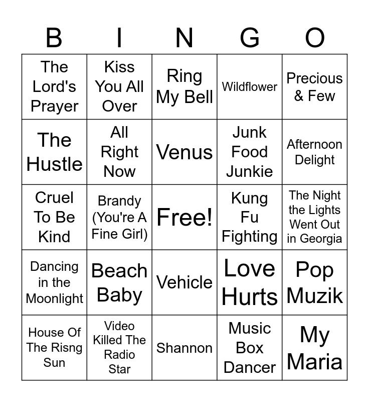 This bingo card has a free space and 39 words: The Rapper, Ride Captain Ride, Love Grows (Where My Rosemary Goes), All Right Now, House Of The Risng Sun, Vehicle, Venus, Me & Mrs. Jones, Precious & Few, Dancing in the Moonlight, Brandy (You're A Fine Girl), Wildflower, My Maria, The Night the Lights Went Out in Georgia, Kung Fu Fighting, Beach Baby, Rock Your Baby, The Lord's Prayer, I'm Easy, Love Hurts, The Hustle, Shannon, Junk Food Junkie, Afternoon Delight, Play That Funky Music White Boy, Ariel, You Light Up My Life, Smoke From A Distant Fire, Don't Leave Me This Way, Kiss You All Over, Magnet And Steel, Knock On Wood, Ring My Bell, Video Killed The Radio Star, Music Box Dancer, Cars, Pop Muzik, Cruel To Be Kind and Savannah Nights.