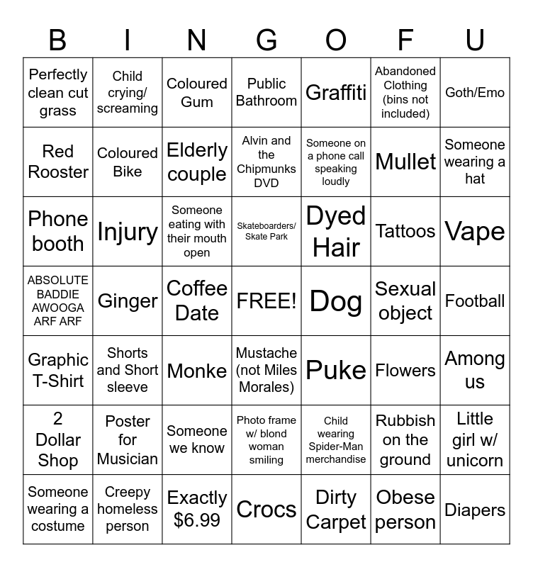 This bingo card has a free space and 48 words: Child wearing Spider-Man merchandise, Mullet, Crocs, Ginger, Someone eating with their mouth open, Football, Child crying/ screaming, Creepy homeless person, Abandoned Clothing (bins not included), Mustache (not Miles Morales), Goth/Emo, Public Bathroom, Tattoos, Dyed Hair, 2 Dollar Shop, Sexual object, Red Rooster, Someone wearing a hat, Rubbish on the ground, Graffiti, Someone on a phone call speaking loudly, Coffee Date, Perfectly clean cut grass, Coloured Bike, Little girl w/ unicorn, Elderly couple, Vape, Someone wearing a costume, Skateboarders/ Skate Park, Injury, Obese person, Dog, Among us, Poster for Musician, ABSOLUTE BADDIE AWOOGA ARF ARF, Puke, Flowers, Phone booth, Monke, Someone we know, Graphic T-Shirt, Diapers, Coloured Gum, Exactly $6.99, Alvin and the Chipmunks DVD, Photo frame w/ blond woman smiling, Shorts and Short sleeve and Dirty Carpet.
