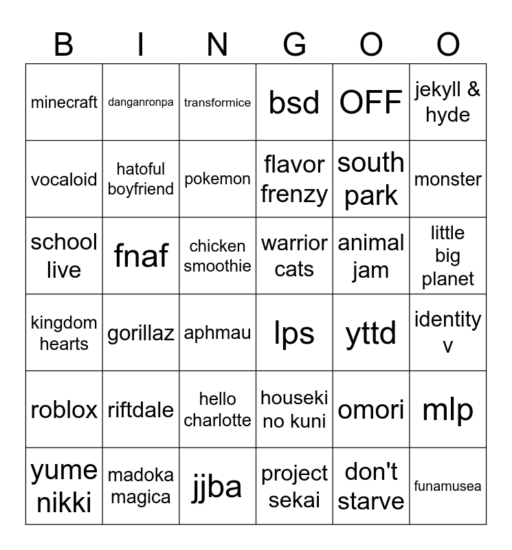 This bingo card has 36 words: houseki no kuni, hello charlotte, project sekai, vocaloid, kingdom hearts, warrior cats, hatoful boyfriend, jjba, OFF, omori, monster, bsd, mlp, fnaf, flavor frenzy, minecraft, roblox, animal jam, school live, transformice, chicken smoothie, gorillaz, lps, aphmau, yttd, danganronpa, south park, madoka magica, pokemon, jekyll & hyde, funamusea, yume nikki, identity v, little big planet, riftdale and don't starve.