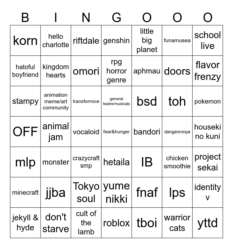 This bingo card has a free space and 48 words: fnaf, doors, roblox, animal jam, transformice, houseki no kuni, hello charlotte, don't starve, funamusea, hetaila, school live, genshin, toh, bsd, minecraft, danganronpa, hatoful boyfriend, flavor frenzy, lps, little big planet, aphmau, vocaloid, korn, kingdom hearts, identity v, omori, pokemon, jekyll & hyde, general teatre/musicals, animation meme/art community, warrior cats, bandori, project sekai, jjba, OFF, IB, chicken smoothie, stampy, crazycraft smp, Tokyo soul, mlp, yttd, riftdale, cult of the lamb, rpg horror genre, yume nikki, monster and tboi.