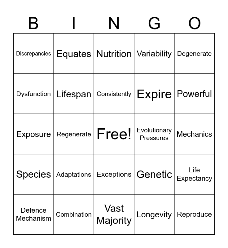 This bingo card has a free space and 24 words: Adaptations, Combination, Consistently, Defence Mechanism, Degenerate, Discrepancies, Dysfunction, Equates, Evolutionary Pressures, Exceptions, Expire, Exposure, Genetic, Life Expectancy, Lifespan, Longevity, Mechanics, Nutrition, Powerful, Regenerate, Reproduce, Species, Variability and Vast Majority.