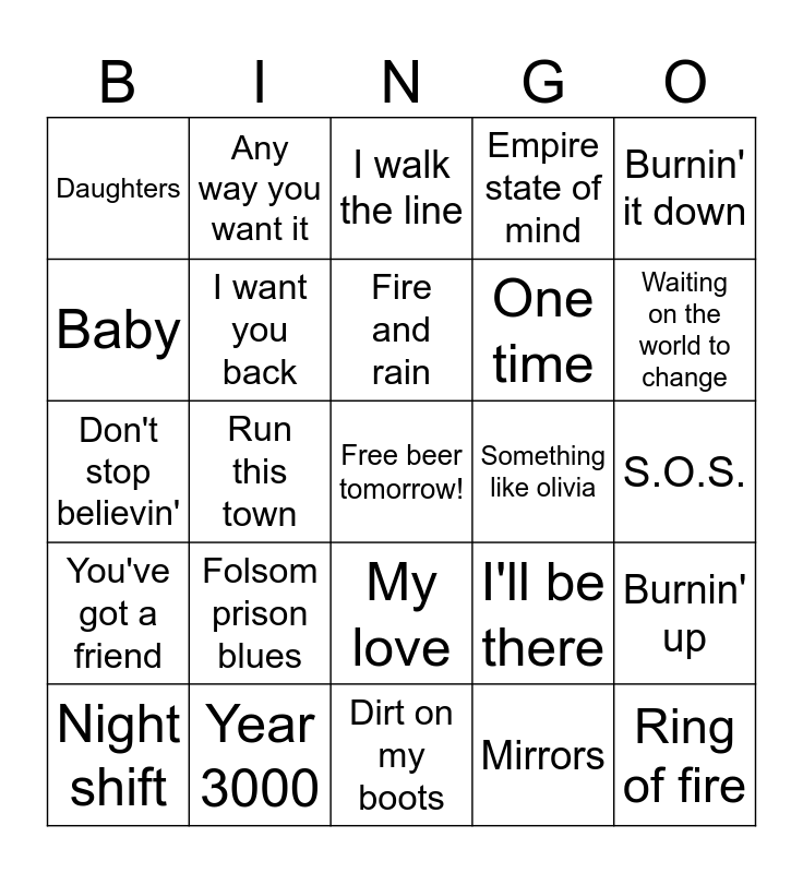 This bingo card has a free space and 36 words: Banana pancakes, Upside down, ABC, I want you back, I'll be there, You've got a friend, Fire and rain, Dirt road anthem, Burnin' it down, She's country, Run this town, Empire state of mind, Margaritaville, Something like olivia, Waiting on the world to change, Daughters, Your body is a wonderland, Folsom prison blues, Ring of fire, I walk the line, S.O.S., Burnin' up, Year 3000, Night shift, Dirt on my boots, Any way you want it, Don't stop believin', Faithfully, One time, Baby, What do you mean?, Sorry, Mirrors, My love, Cry me a river and Rock your body.