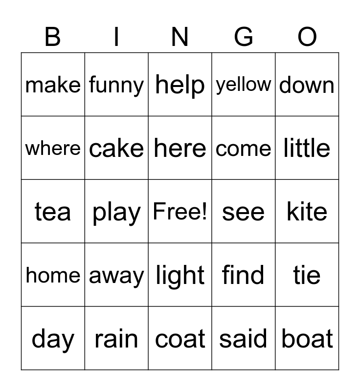 This bingo card has a free space and 24 words: away, rain, here, day, down, make, where, funny, see, light, come, tea, find, tie, cake, said, kite, help, little, play, boat, home, yellow and coat.