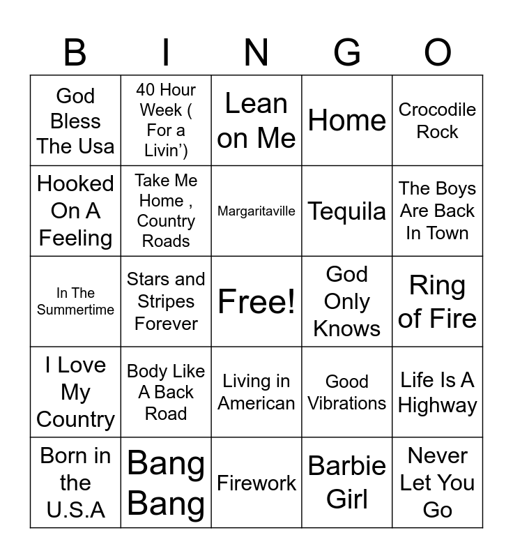 This bingo card has a free space and 57 words: Bad Moon Rising, Born in the U.S.A, American Girl, God Bless The Usa, Firework, Chicken Fried, Take Me Home , Country Roads, Carry on Wayward Son, Tequila, Rich Girl, Home, Mr.Brightside, Kids, Summer Of ‘69, Miami, Stand By Me, Crocodile Rock, Stars and Stripes Forever, Escape ( The Pina Colada Song ), Never Let You Go, God Only Knows, Surfin’ U.S.A, Good Vibrations, Lean on Me, Cheeseburger in Paradise, Margaritaville, Only Wanna Be With you, Hot, Hot, Hot, The Boys Are Back In Town, Old Time Rock & Roll, La Bamba, Uptight ( everything is alright ), American Woman, Beer Never Broke My Heart, Ring of Fire, Hooked On A Feeling, Superstition, In The Summertime, The Longest Time, I Love My Country, 40 Hour Week ( For a Livin’), Living in American, Spirit of America, Made in The USA’, God’s Country, Chattahoochee, Body Like A Back Road, Bang Bang, Summer Nights, Good Time, Nothin’ But a Good Time, Barbie Girl, All Summer Long, R.O.C.K. In The U.S.A., Glory Days, Life Is A Highway and I’m A Believer.