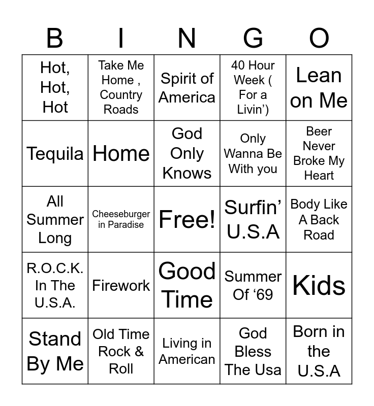 This bingo card has a free space and 53 words: Bad Moon Rising, Born in the U.S.A, American Girl, God Bless The Usa, Firework, Chicken Fried, Take Me Home , Country Roads, Carry on Wayward Son, Tequila, Rich Girl, Home, Mr.Brightside, Kids, Summer Of ‘69, Miami, Stand By Me, God Only Knows, Surfin’ U.S.A, Good Vibrations, Lean on Me, Cheeseburger in Paradise, Margaritaville, Only Wanna Be With you, Hot, Hot, Hot, The Boys Are Back In Town, Old Time Rock & Roll, La Bamba, Uptight ( everything is alright ), American Woman, Beer Never Broke My Heart, Ring of Fire, Hooked On A Feeling, Superstition, In The Summertime, The Longest Time, I Love My Country, 40 Hour Week ( For a Livin’), Living in American, Spirit of America, Made in The USA’, God’s Country, Chattahoochee, Body Like A Back Road, Bang Bang, Summer Nights, Good Time, Nothin’ But a Good Time, Barbie Girl, All Summer Long, R.O.C.K. In The U.S.A., Glory Days, Life Is A Highway and I’m A Believer.