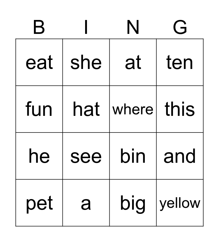 This bingo card has 16 words: a, and, at, eat, he, she, bin, big, fun, hat, pet, ten, see, this, where and yellow.