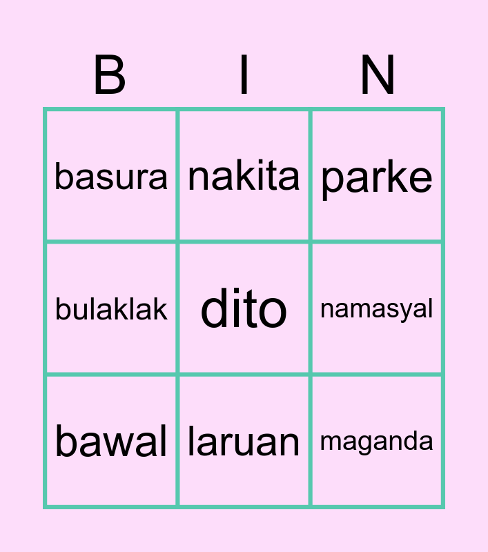 This bingo card has 9 words: bawal, dito, parke, basura, nakita, namasyal, bulaklak, laruan and maganda.