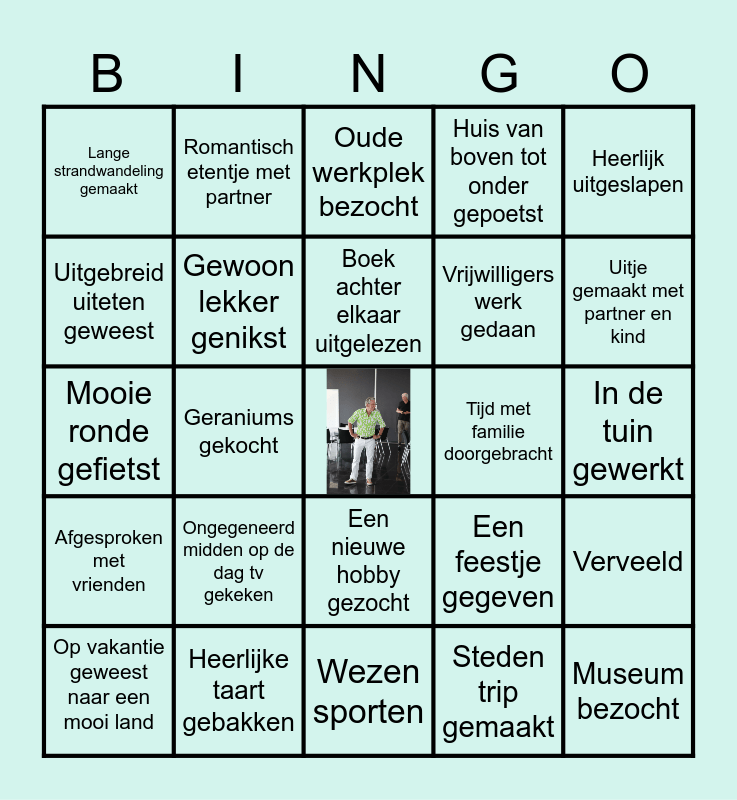 This bingo card has a free space and 24 words: Op vakantie geweest naar een mooi land, Ongegeneerd midden op de dag tv gekeken, Boek achter elkaar uitgelezen, Steden trip gemaakt, Heerlijk uitgeslapen, Lange strandwandeling gemaakt, Romantisch etentje met partner, Oude werkplek bezocht, Tijd met familie doorgebracht, In de tuin gewerkt, Mooie ronde gefietst, Gewoon lekker genikst, Een feestje gegeven, Verveeld, Uitgebreid uiteten geweest, Heerlijke taart gebakken, Wezen sporten, Huis van boven tot onder gepoetst, Uitje gemaakt met partner en kind, Afgesproken met vrienden, Geraniums gekocht, Een nieuwe hobby gezocht, Vrijwilligers werk gedaan and Museum bezocht.