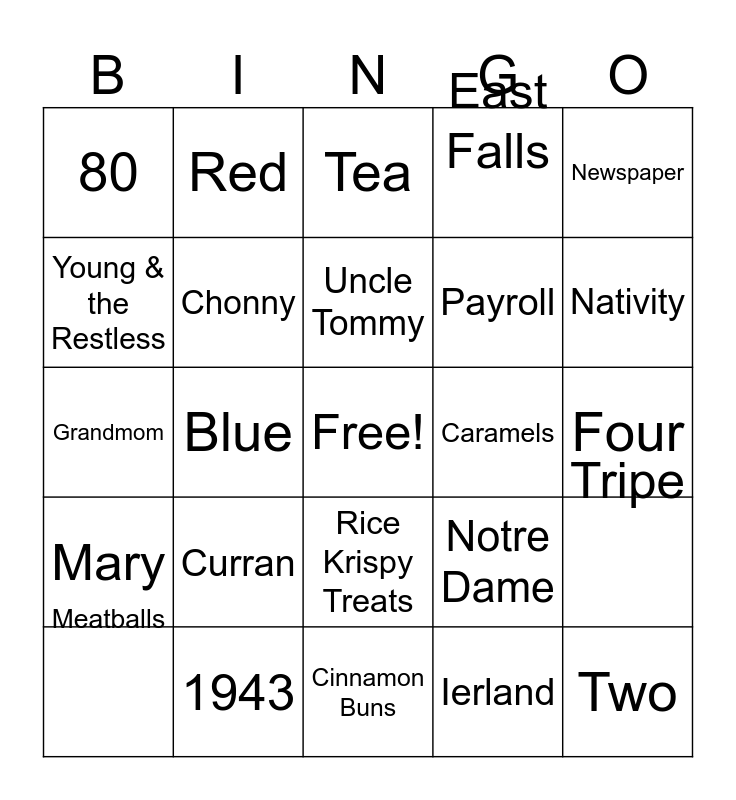 This bingo card has a free space and 30 words: 1943, July 8th, Blue, Cardinal Dougherty, 80, Tea, Chonny, Rice Krispy Treats, Caramels, Cinnamon Buns, Four, Two, Ierland, 8, Nativity, PB + J, Notre Dame, Mary, Curran, Newspaper, Grandmom, Blue, Red, Payroll, Young & the Restless, East Falls, Tripe, Meatballs, Uncle Tommy and A Bakery.
