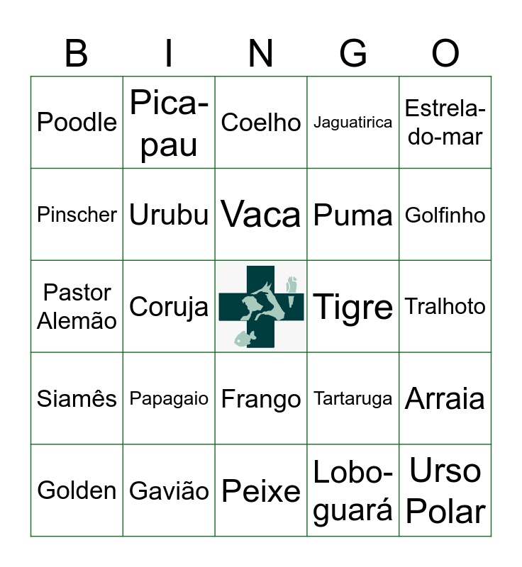 This bingo card has a free space and 80 words: Pug, Pato, Coelho, Onça, Tubarão, Shih Tzu, Ganso, Búfalo, Leão, Baleia, Buldogue, Marreco, Jaguatirica, Estrela-do-mar, Salsicha, Urubu, Boi, Tigre, Cavalo-marinho, Pastor Alemão, Pavão, Vaca, Puma, Golfinho, Poodle, Tucano, Ovelha, Leopardo, Carpa, Labrador, Papagaio, Bode, Lobo-guará, Tralhoto, Golden, Gavião, Cabra, Sagui, Arraia, Pinscher, Águia, Carneiro, Jacaré, Moreia, Chow Chow, Pica-pau, Bisonte, Cagado, Lula, Pit Bull, Beija-flor, Peixe, Tartaruga, Crocodilo, Rottweiler, Pinguim, Abelha, Macaco-prego, Foca, Siamês, Coruja, Porco, Harpia, Água-viva, Angorá, Pombo, Codorna, Capivara, Urso Polar, Persa, Flamingo, Frango, Tamanduá, Polvo, Sphynx, Calopsita, Peru, Jiboia, Piranha and Avestruz.