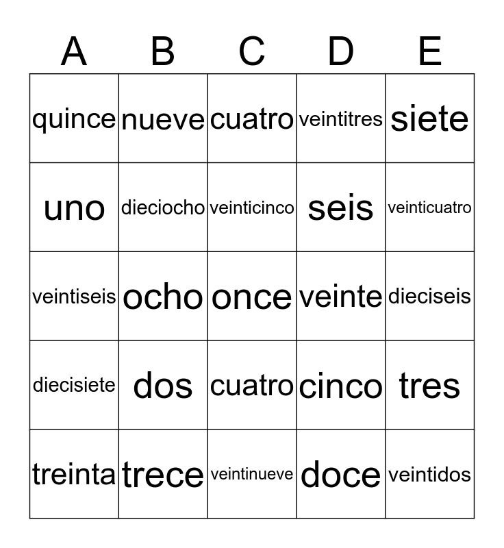 This bingo card has a free space and 24 words: dos, trece, veinticinco, treinta, siete, quince, uno, nueve, veinte, cuatro, seis, veintiseis, cinco, tres, dieciocho, doce, dieciseis, cuatro, veinticuatro, ocho, veintidos, diecisiete, veintitres and veintinueve.