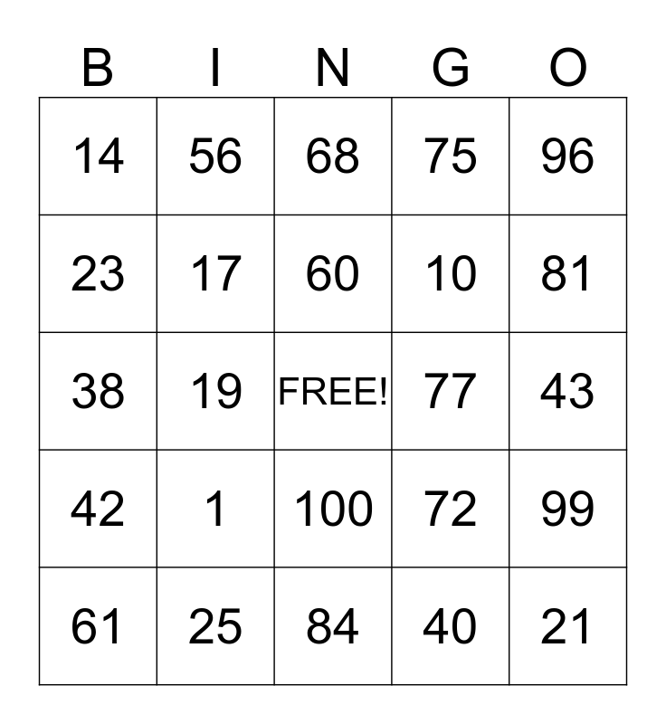 This bingo card has a free space and 24 words: 1, 25, 60, 61, 96, 14, 23, 56, 77, 100, 10, 38, 72, 99, 17, 40, 43, 68, 81, 19, 21, 42, 75 and 84.