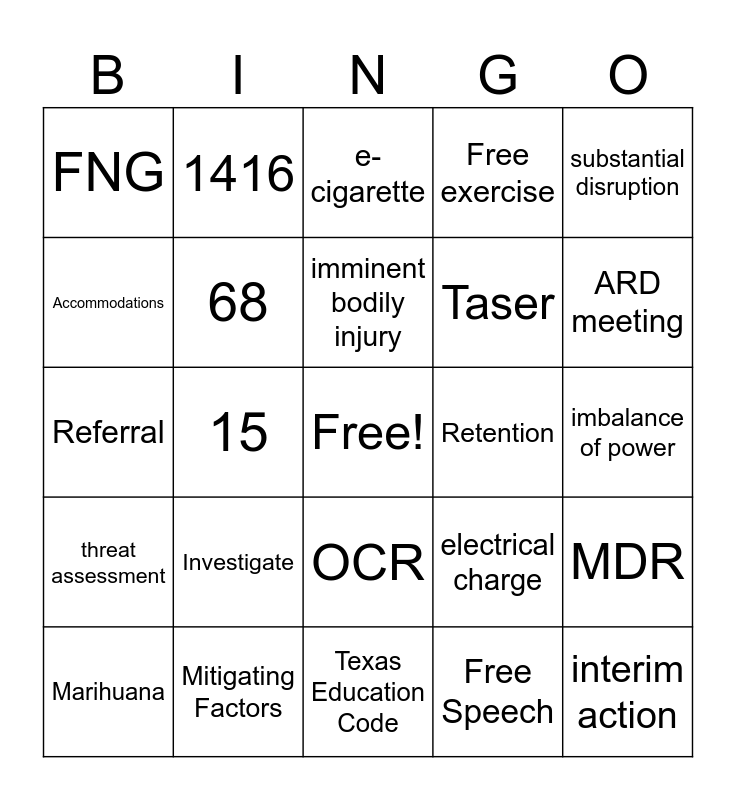 This bingo card has a free space and 31 words: Texas Education Code, Full Individual Evaluation (FIE), 15, Accelerated Education Plan, FNG, e-cigarette, 68, electrical charge, Retention, Free Speech, imbalance of power, interim action, First Amendment, documentation, ARD meeting, Notice, MDR, Investigate, threat assessment, OCR, substantial disruption, Violent Conduct, Marihuana, 1416, Taser, Accommodations, Free exercise, Referral, Mitigating Factors, imminent bodily injury and 3803.