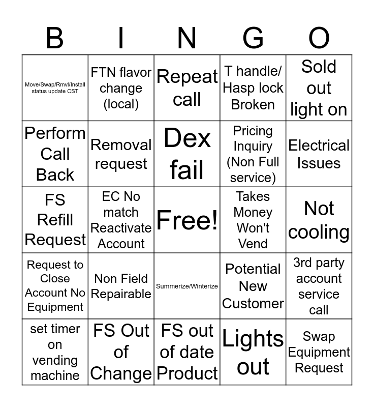 This bingo card has a free space and 24 words: Non Field Repairable, FS Out of Change, Dex fail, set timer on vending machine, Sold out light on, Move/Swap/Rmvl/Install status update CST, Perform Call Back, FTN flavor change (local), Takes Money Won't Vend, Summerize/Winterize, Pricing Inquiry (Non Full service), FS Refill Request, Potential New Customer, 3rd party account service call, Removal request, Lights out, Not cooling, Repeat call, Electrical Issues, EC No match Reactivate Account, Swap Equipment Request, Request to Close Account No Equipment, T handle/ Hasp lock Broken and FS out of date Product.