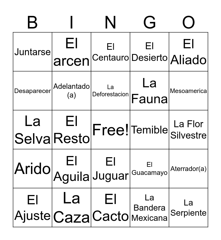 This bingo card has a free space and 24 words: El Aguila, La Caza, La Deforestacion, El Ajuste, El Aliado, Juntarse, Desaparecer, El arcen, Temible, El Juguar, La Fauna, La Selva, El Guacamayo, Aterrador(a), Adelantado (a), La Bandera Mexicana, La Flor Silvestre, El Centauro, Mesoamerica, El Resto, La Serpiente, Arido, El Desierto and El Cacto.