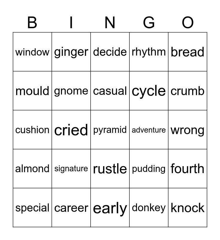 This bingo card has a free space and 29 words: special, threw, cried, complete, window, decide, gnome, signature, adventure, career, wrong, knock, early, donkey, crumb, purse, rustle, almond, bread, cushion, pudding, behind, cycle, mould, rhythm, ginger, fourth, casual and echoes.