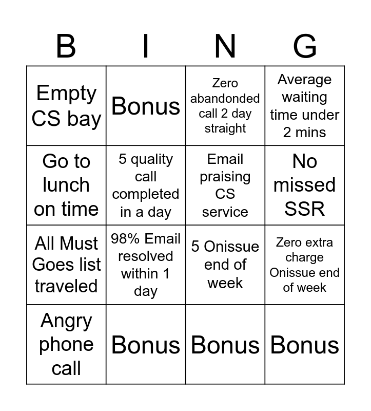 This bingo card has 16 words: Angry phone call, Bonus, Zero abandonded call 2 day straight, Average waiting time under 2 mins, Go to lunch on time, Bonus, 5 Onissue end of week, Zero extra charge Onissue end of week, Empty CS bay, 5 quality call completed in a day, Bonus, No missed SSR, All Must Goes list traveled, 98% Email resolved within 1 day, Email praising CS service and Bonus.
