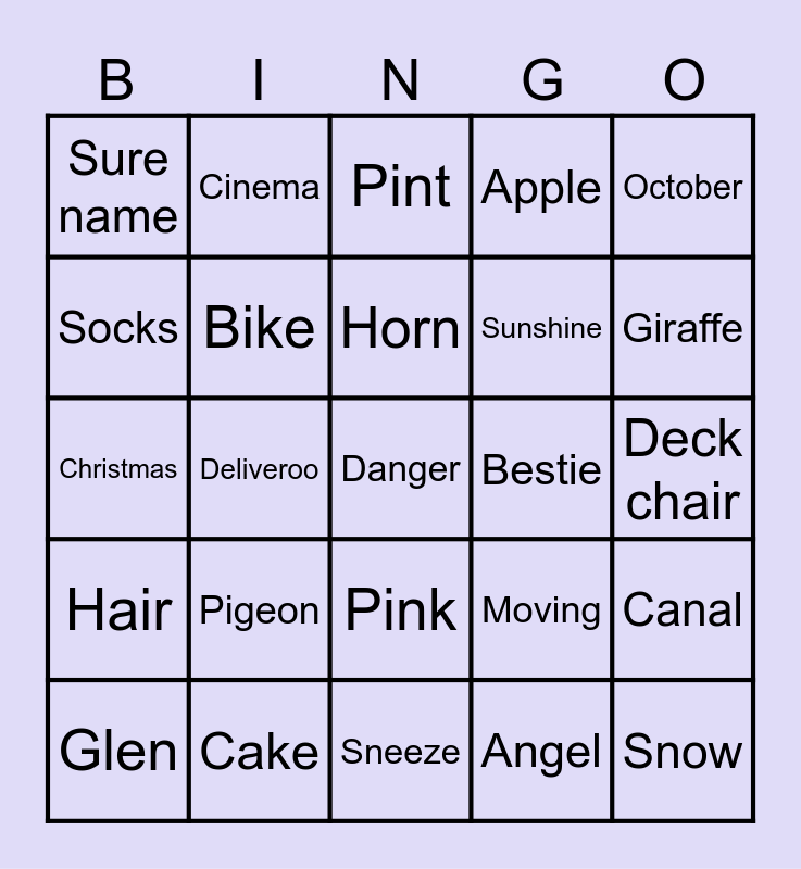 This bingo card has 25 words: Pigeon, Sneeze, Horn, Glen, October, Sure name, Socks, Cinema, Bestie, Pink, Sunshine, Christmas, Moving, Canal, Bike, Snow, Deck chair, Pint, Giraffe, Deliveroo, Danger, Cake, Hair, Apple and Angel.
