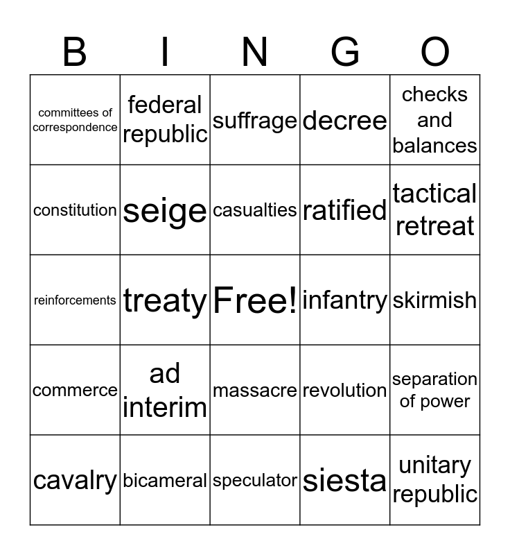 This bingo card has a free space and 24 words: ad interim, bicameral, casualties, cavalry, checks and balances, committees of correspondence, constitution, federal republic, infantry, massacre, ratified, reinforcements, revolution, separation of power, seige, siesta, skirmish, suffrage, tactical retreat, treaty, unitary republic, commerce, decree and speculator.