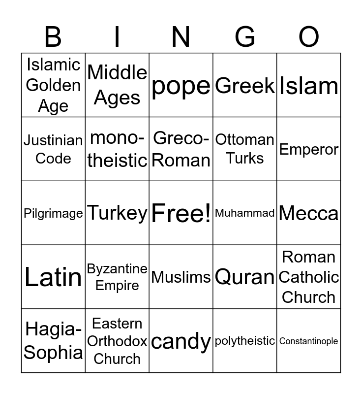 This bingo card has a free space and 24 words: Byzantine Empire, Eastern Orthodox Church, Greco-Roman, Hagia-Sophia, Islam, Islamic Golden Age, Justinian Code, Middle Ages, Muhammad, Muslims, Ottoman Turks, Pilgrimage, Quran, Roman Catholic Church, mono-theistic, polytheistic, Mecca, pope, Emperor, Turkey, Constantinople, Latin, Greek and candy.