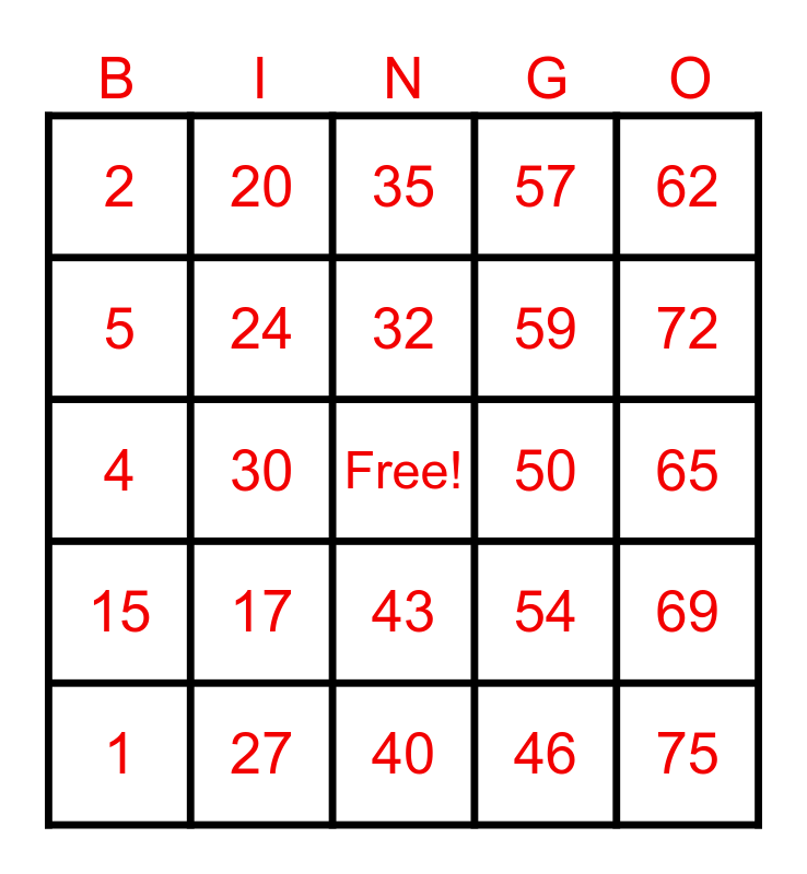 This bingo card has a free space and 24 words: 1, 17, 32, 46, 62, 2, 20, 35, 50, 65, 4, 24, 54, 69, 5, 27, 40, 57, 72, 15, 30, 43, 59 and 75.